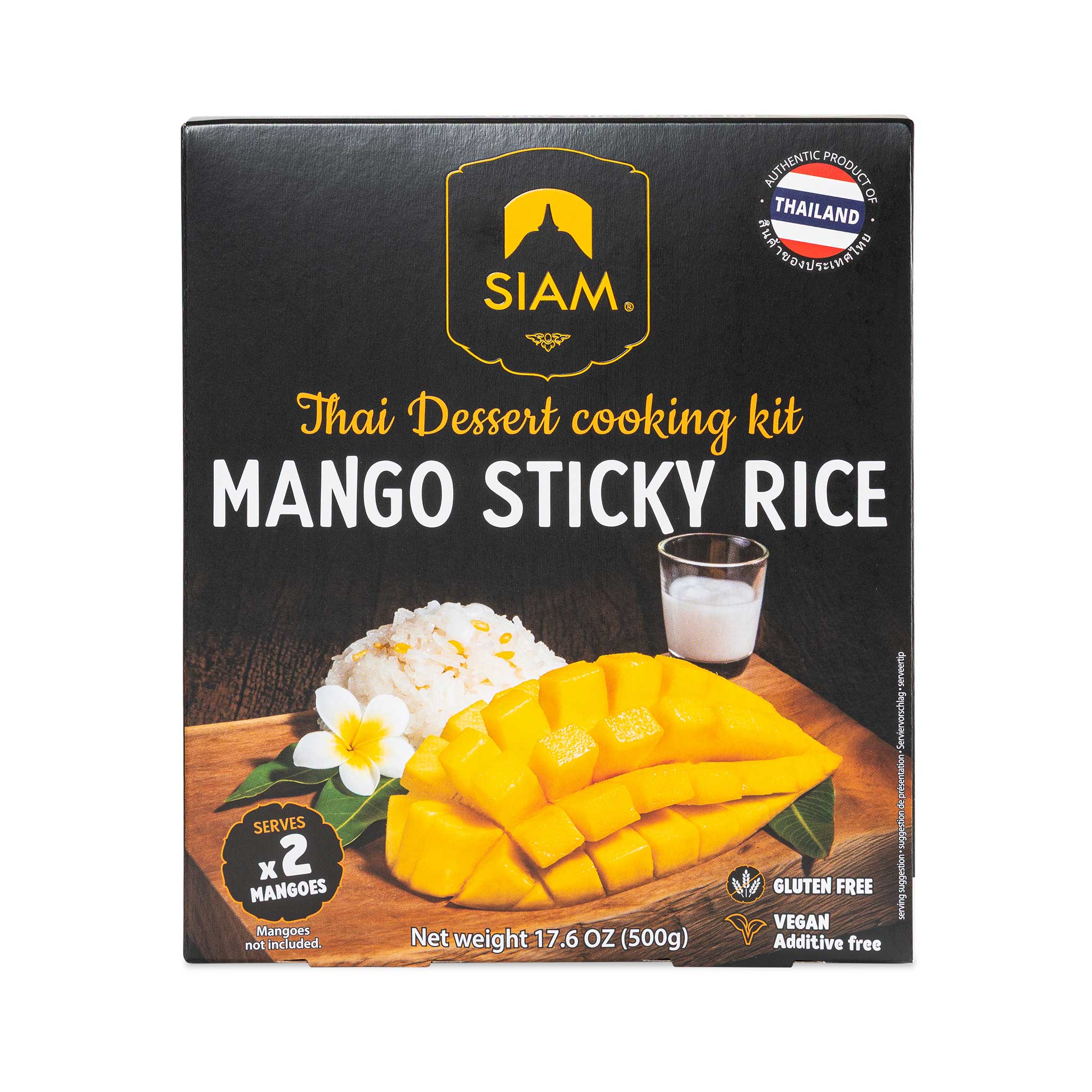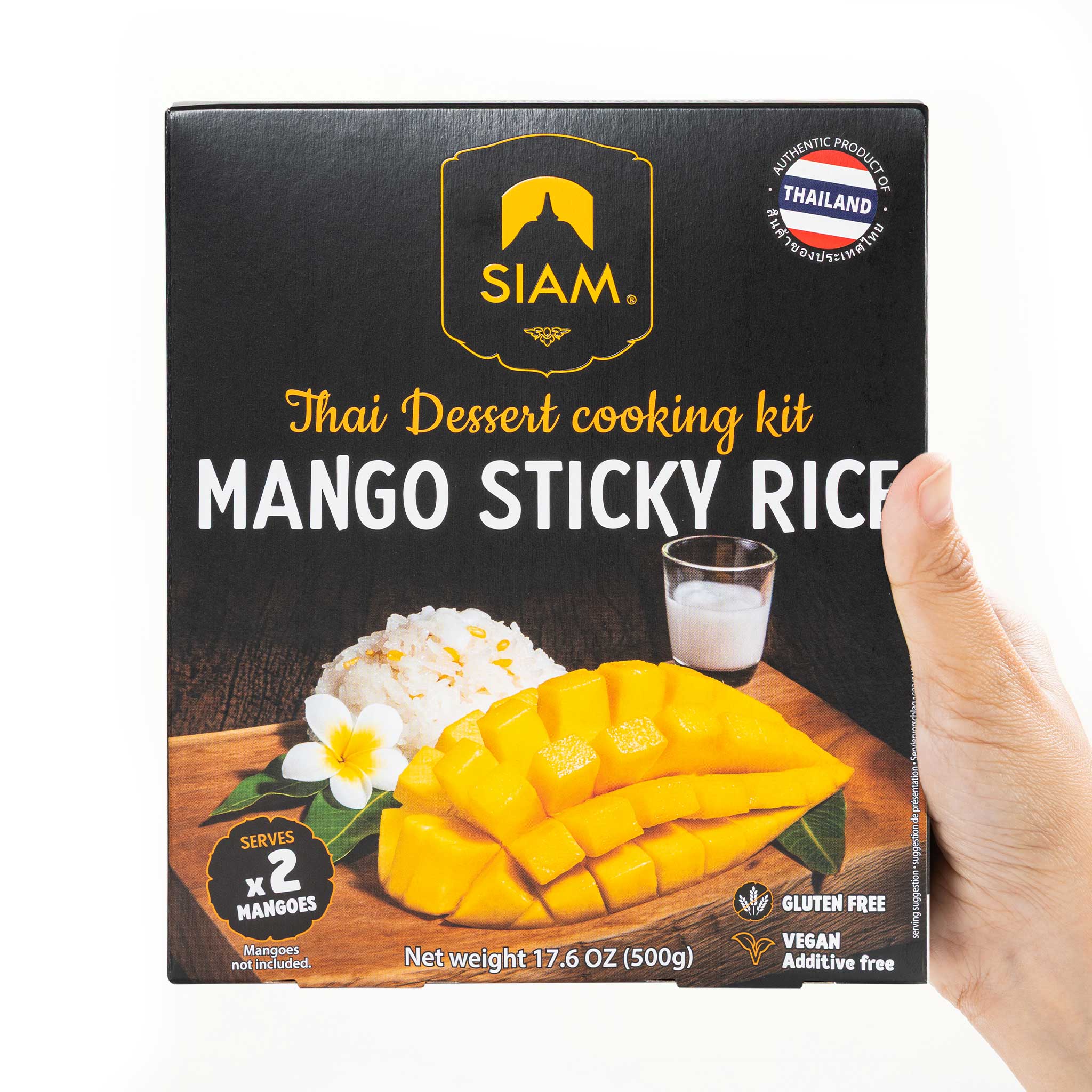 Ingrédients : Riz gluant thaïlandais (blanc) 250g, lait de coco 200g [extrait de noix de coco (noix de coco, eau) 75,00%, eau], sucre de coco 40g, haricots mungo 10g.