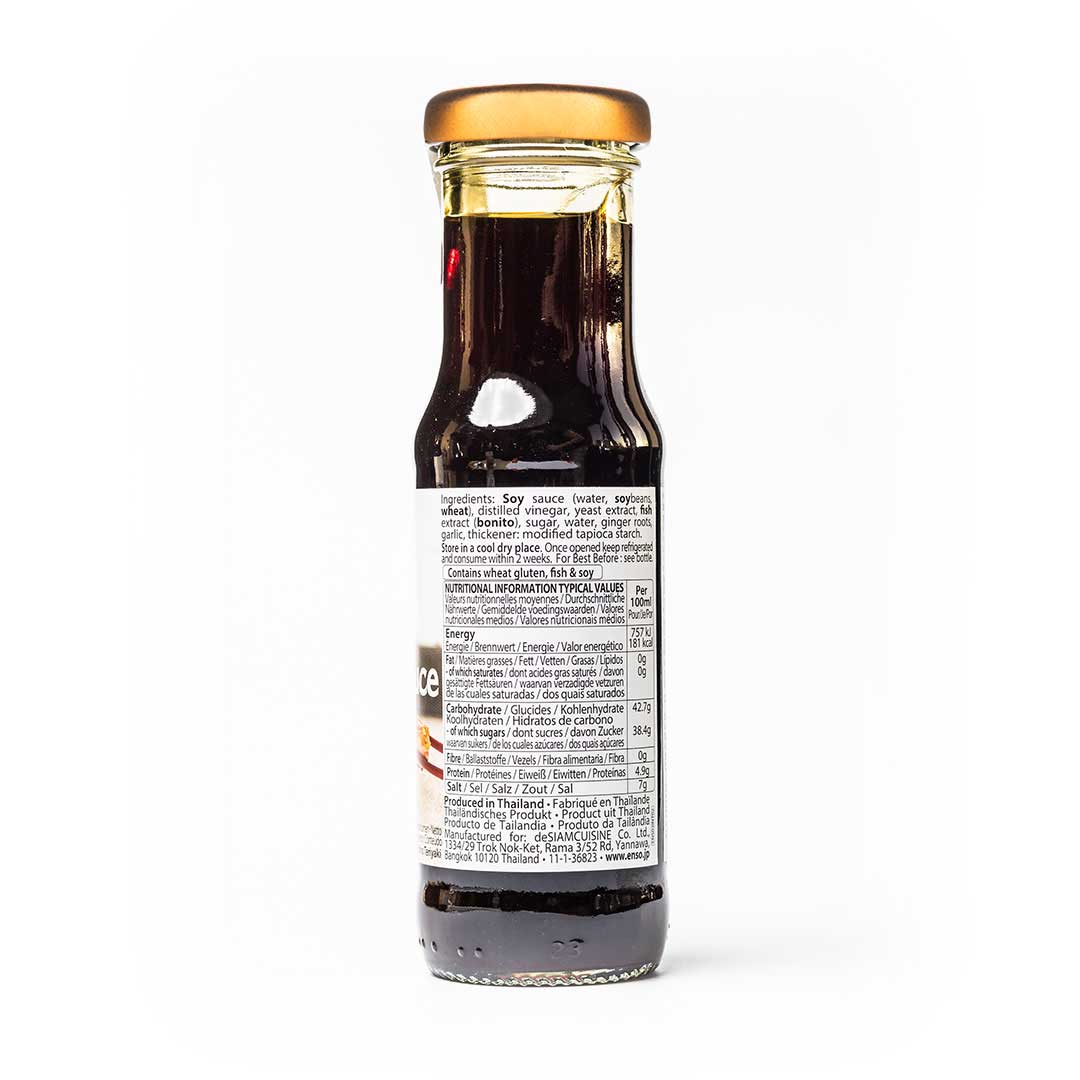 Ingrédients : Sauce soja (eau, fèves de soja, farine de blé, sel, sucre), vinaigre distillé (eau, régulateur d'acidité : acide acétique), extrait de levure, extrait de poisson (bonite), sucre, eau, racines de gingembre, ail, épaississant : Amidon de tapioca modifié.