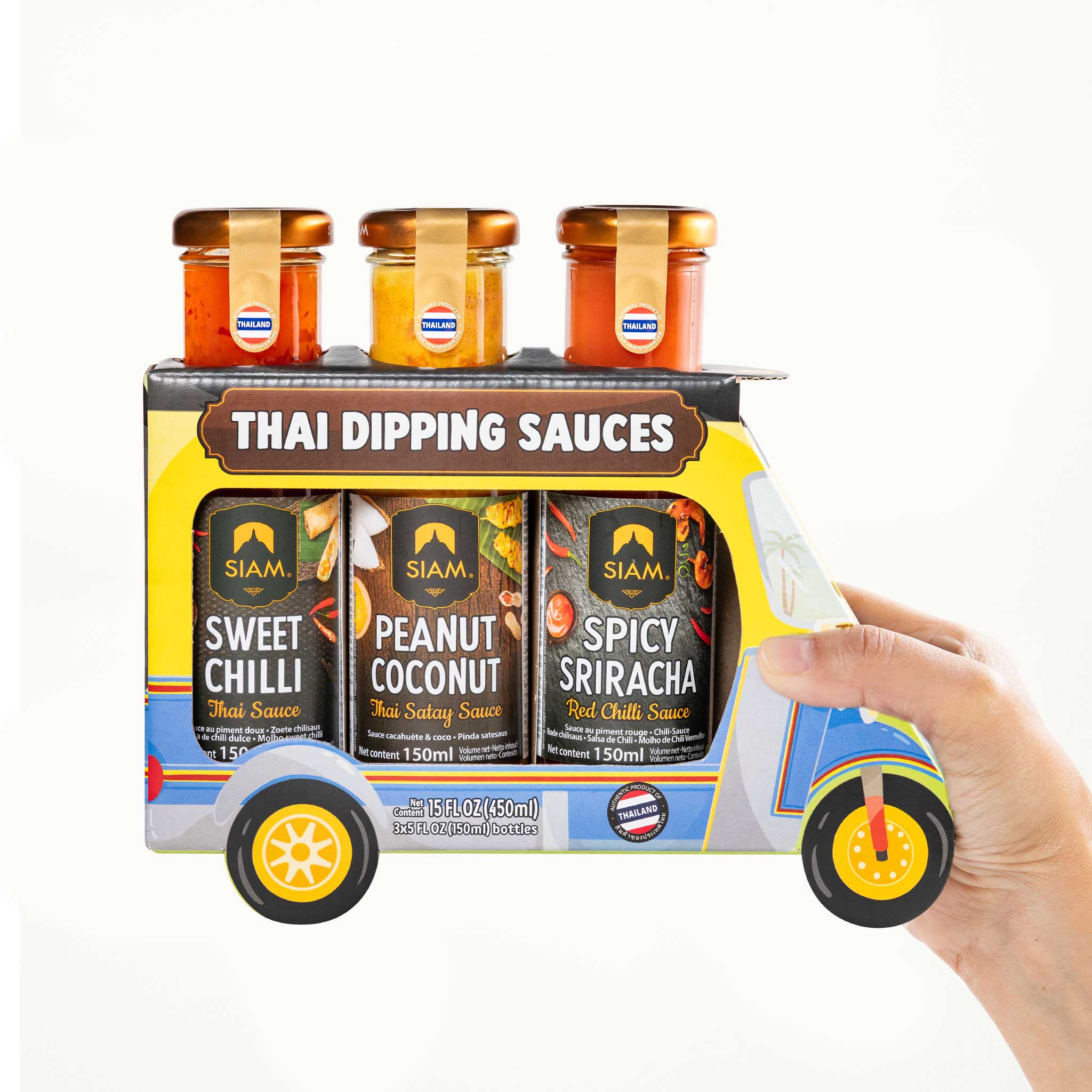 Ingrédients : Eau, sucre, piment 13,40%, extrait de noix de coco (noix de coco, eau) 6,70%, ail, cacahuètes, vinaigre distillé (eau, régulateur d'acidité : acide acétique), sel, tamarin, huile de tournesol, épaississant : Amidon de Tapioca Modifié, Graines de Sésame, Graines de Coriandre, Épaississant : Amidon de Tapioca Modifié, Régulateur d'Acidité : Acide Acétique, Citronnelle, Echalotes, Régulateur d'Acidité : Acide lactique, Conservateur : Benzoate de sodium, Épaississant : Gomme xanthane, graines de cardamome, graines de cumin, racines de galanga, graines de moutarde, curcuma, antioxydant : Acide ascorbique, écorce de citron vert Kaffir.