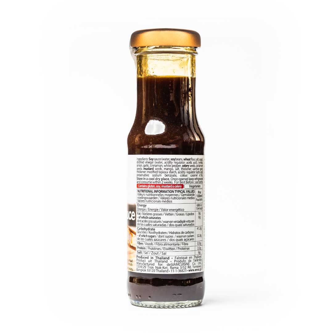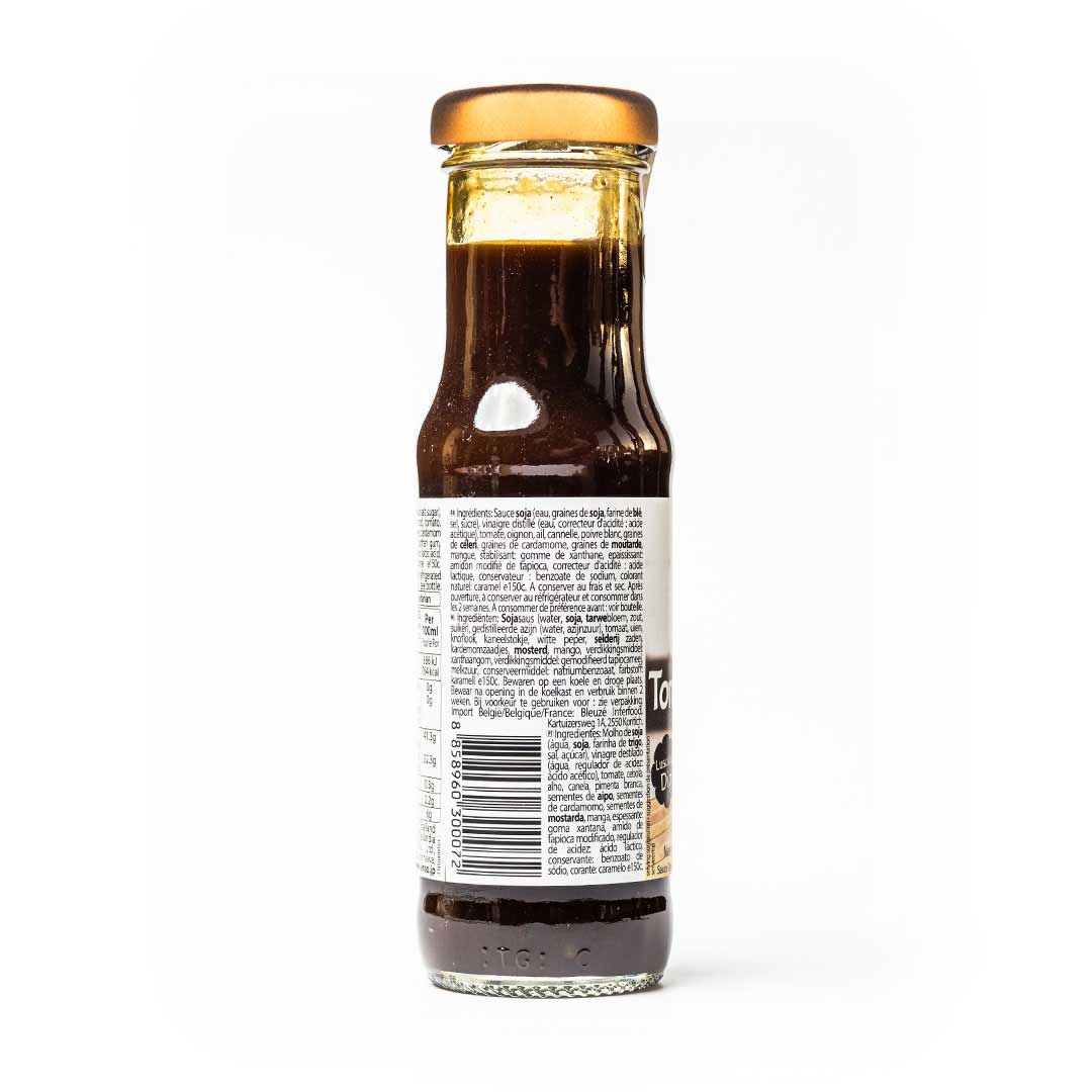 Ingrédients : Sucre, sauce soja (eau, graines de soja, farine de blé, sel, sucre), eau, eau, vinaigre distillé (eau, régulateur d'acidité : acide acétique), tomate, oignon, ail, cannelle, poivre blanc, graines de céleri, graines de cardamome, graines de moutarde, mangue, sel, épaississant : Gomme Xanthane, Epaississant : Amidon de tapioca modifié, Régulateur d'acidité : Acide lactique, Conservateur : Benzoate de Sodium, Colorant : Caramel E150C.